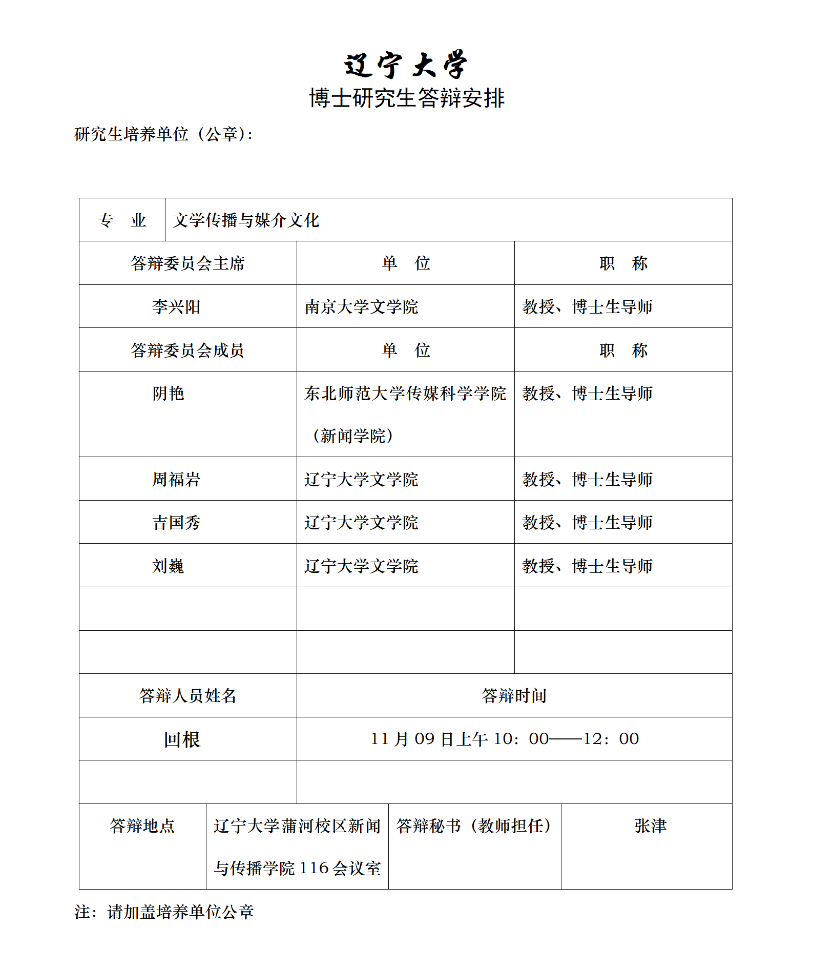 新闻与传播学院2025下半年辽宁大学博士研究生答辩安排